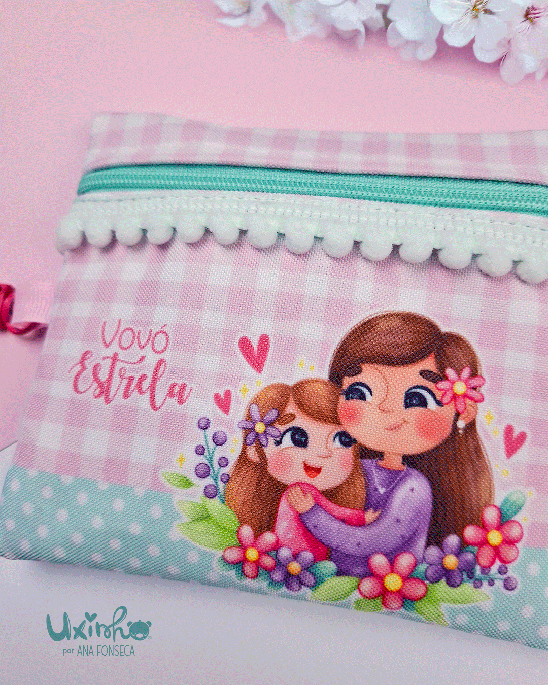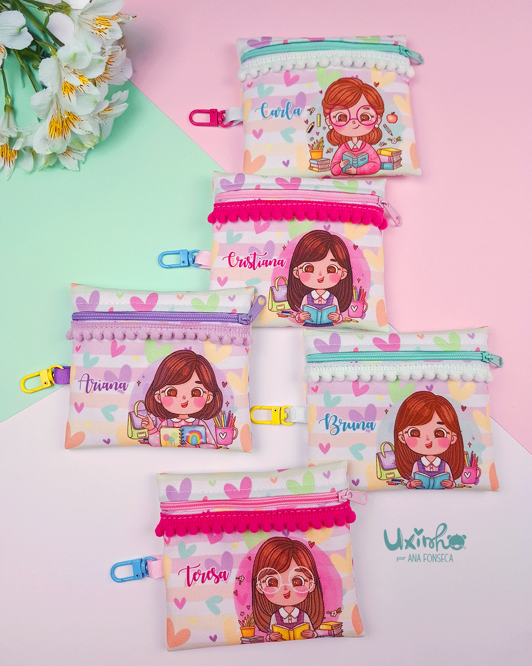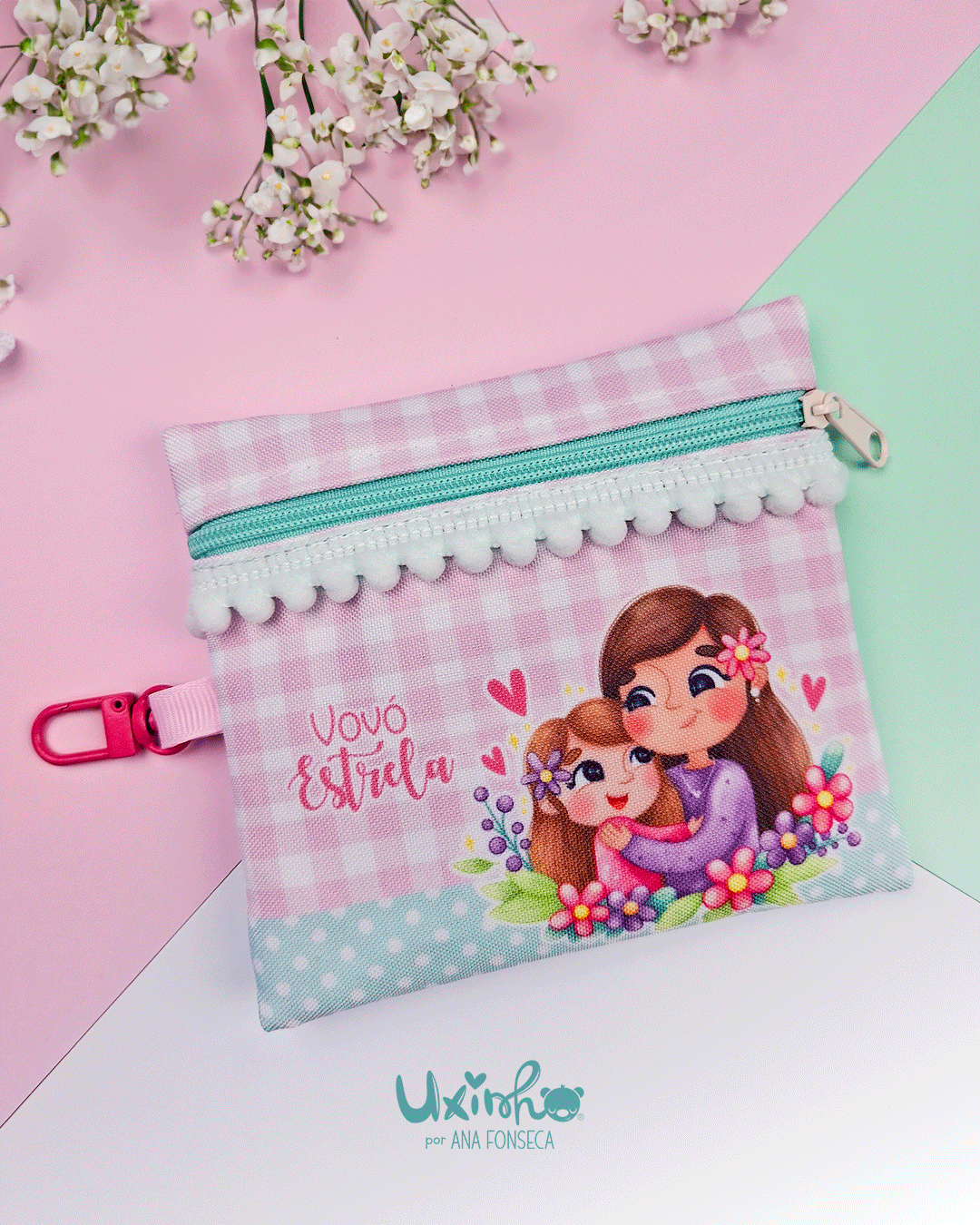 * Fecho, pompons, fita e mosquetão de cores aleatórias dentro dos tons do padrão/ilustração.