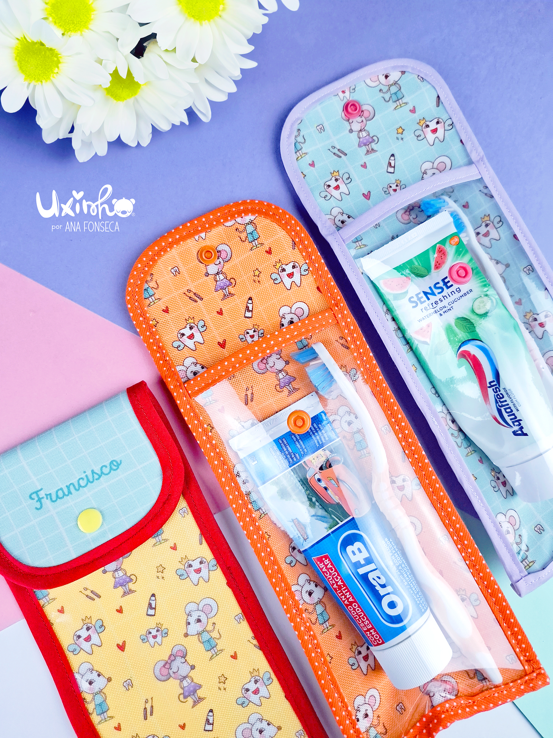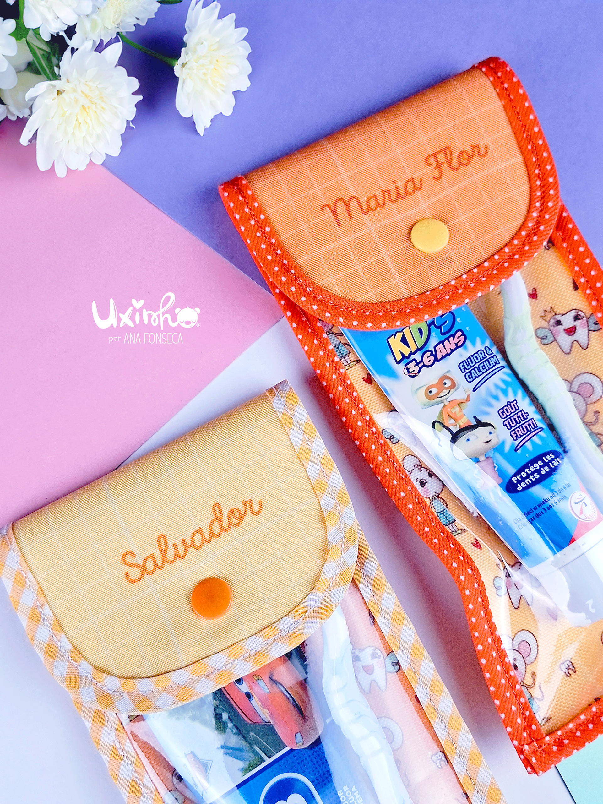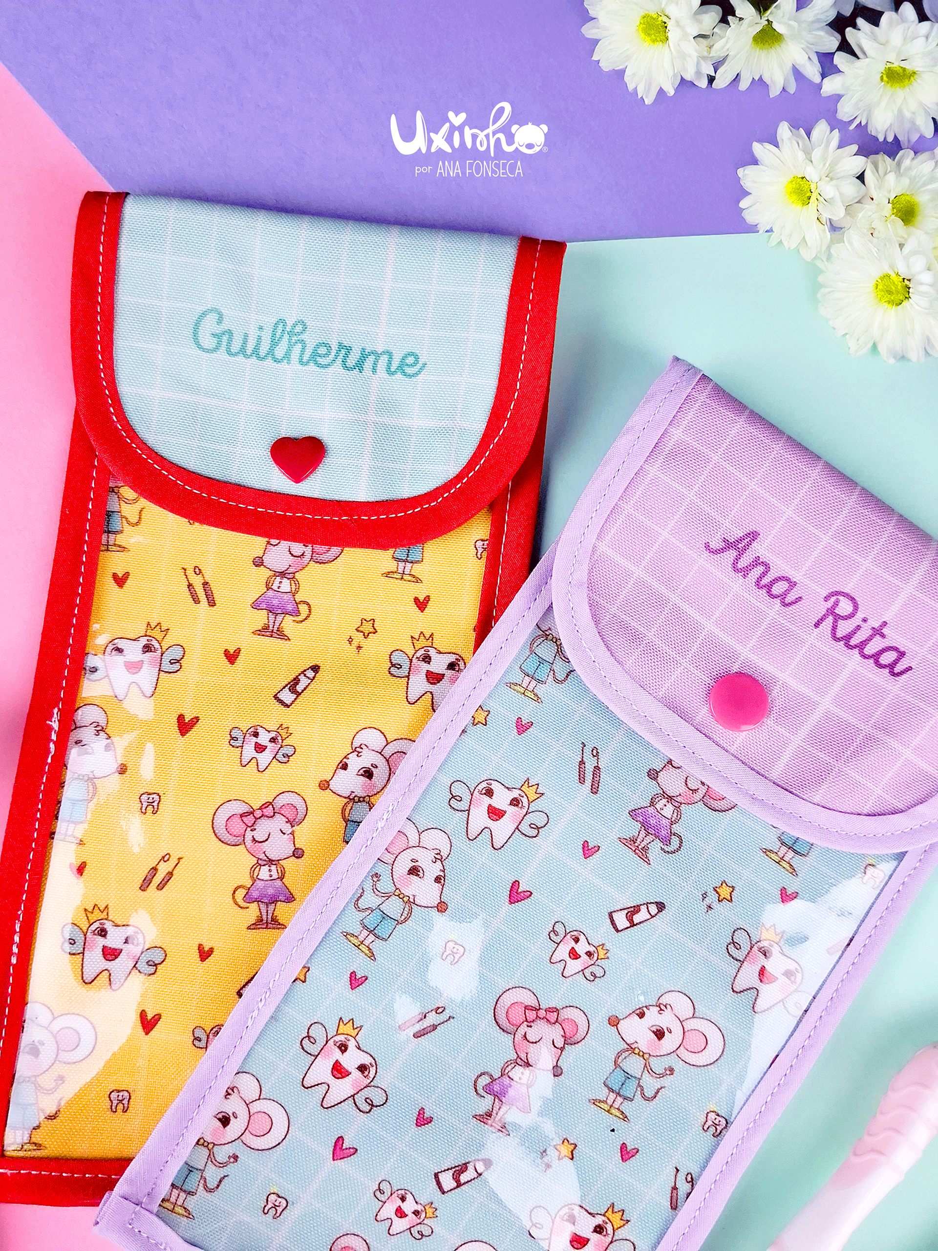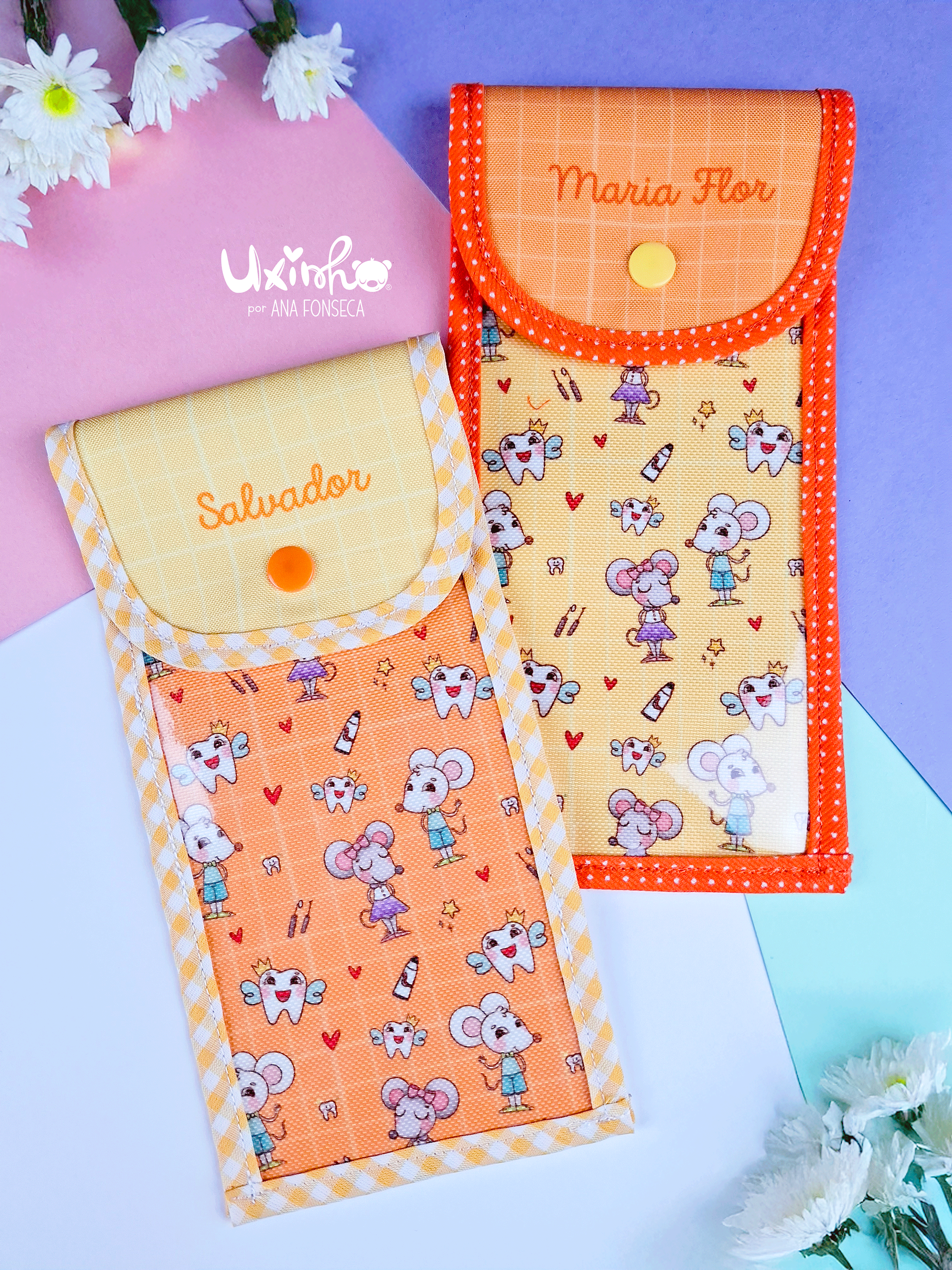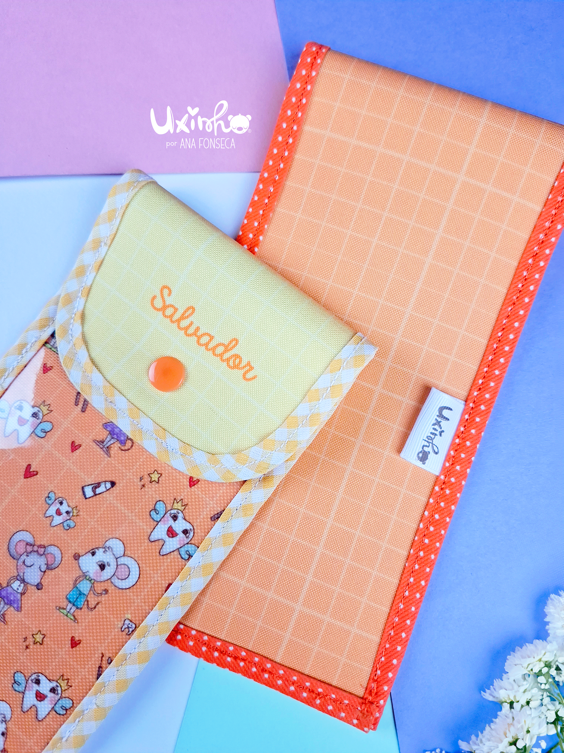 Estojos costurados à mão de raíz. Cheios de bonitos detalhes.