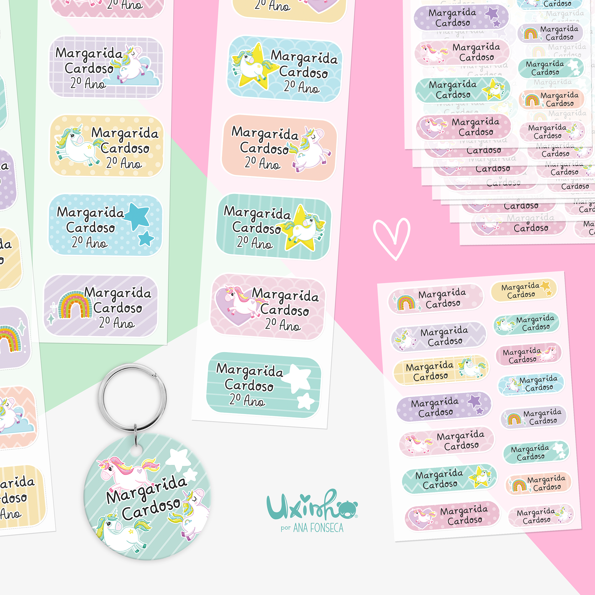 É possível aplicar estes temas a outros produtos Uxinho, nomeadamente: garrafa de alumínio, estojo, Caderno, porta-moedas, Sacos de pano, mealheiros, canecas, tapetes de rato, canetas, etc.